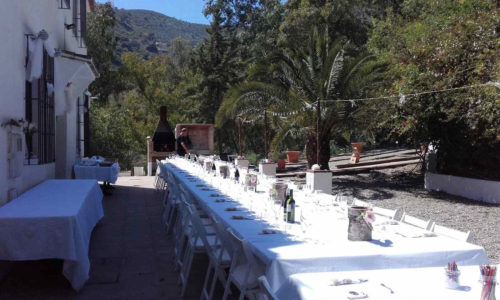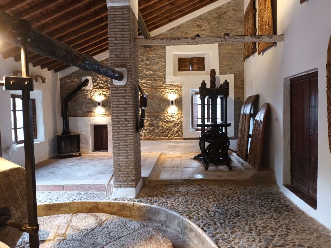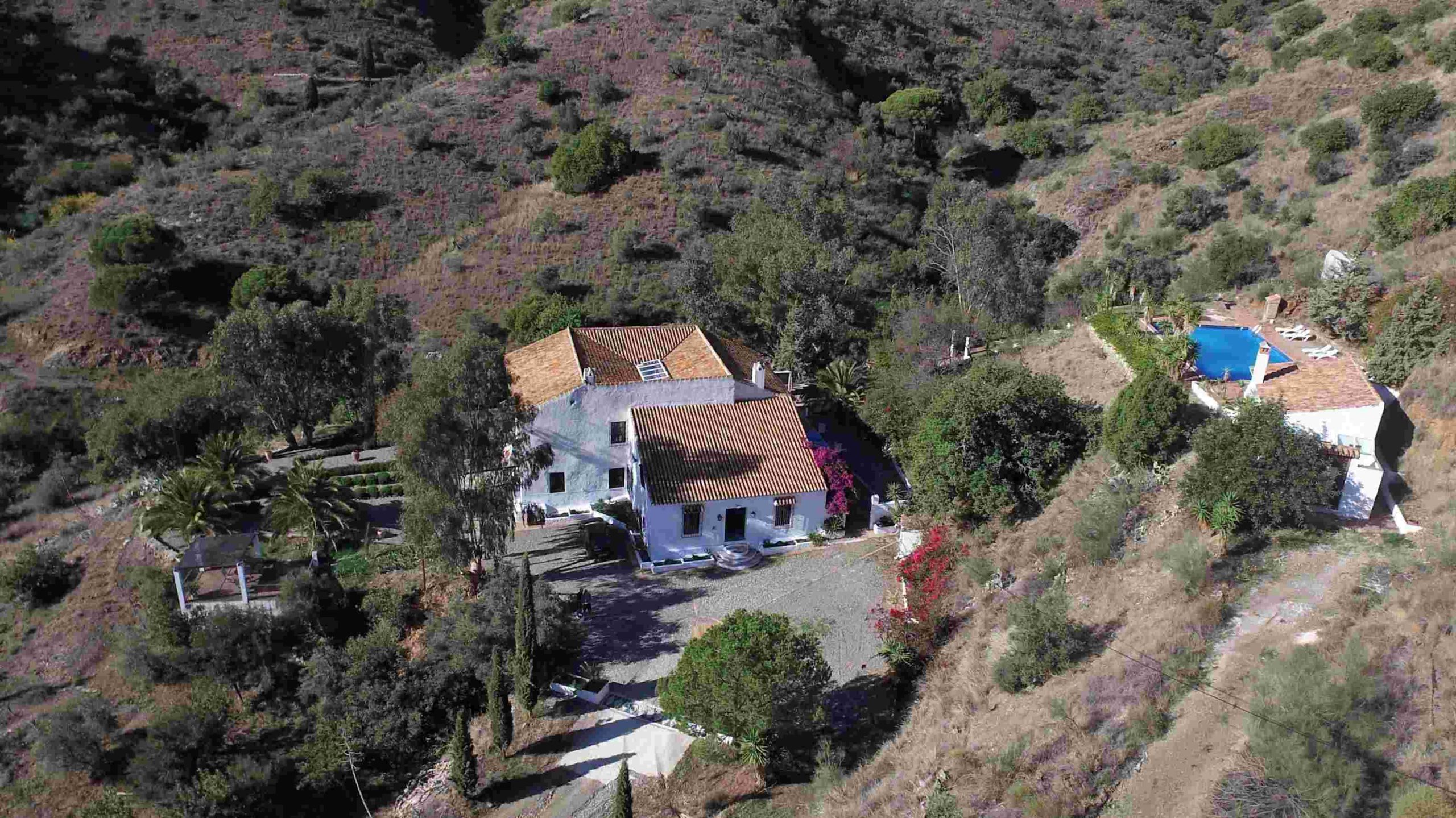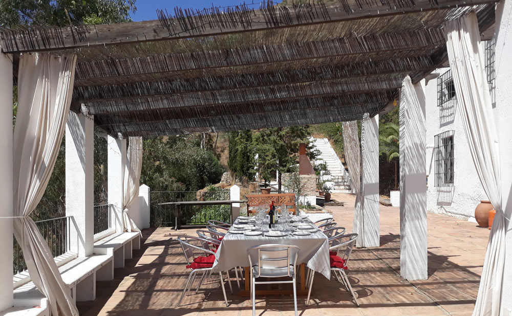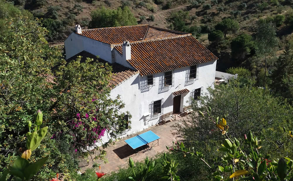 In the middle of 90 acres of olive, almond and carob groves stands a huge classic 19th century “cortijo” (farmhouse), surrounded by shaded terraces and with views across the Montes de Malaga. Until about 60 years ago this was the olive mill serving the local farmers: the stones and press are still intact in the room now used for parties, music and table-tennis.